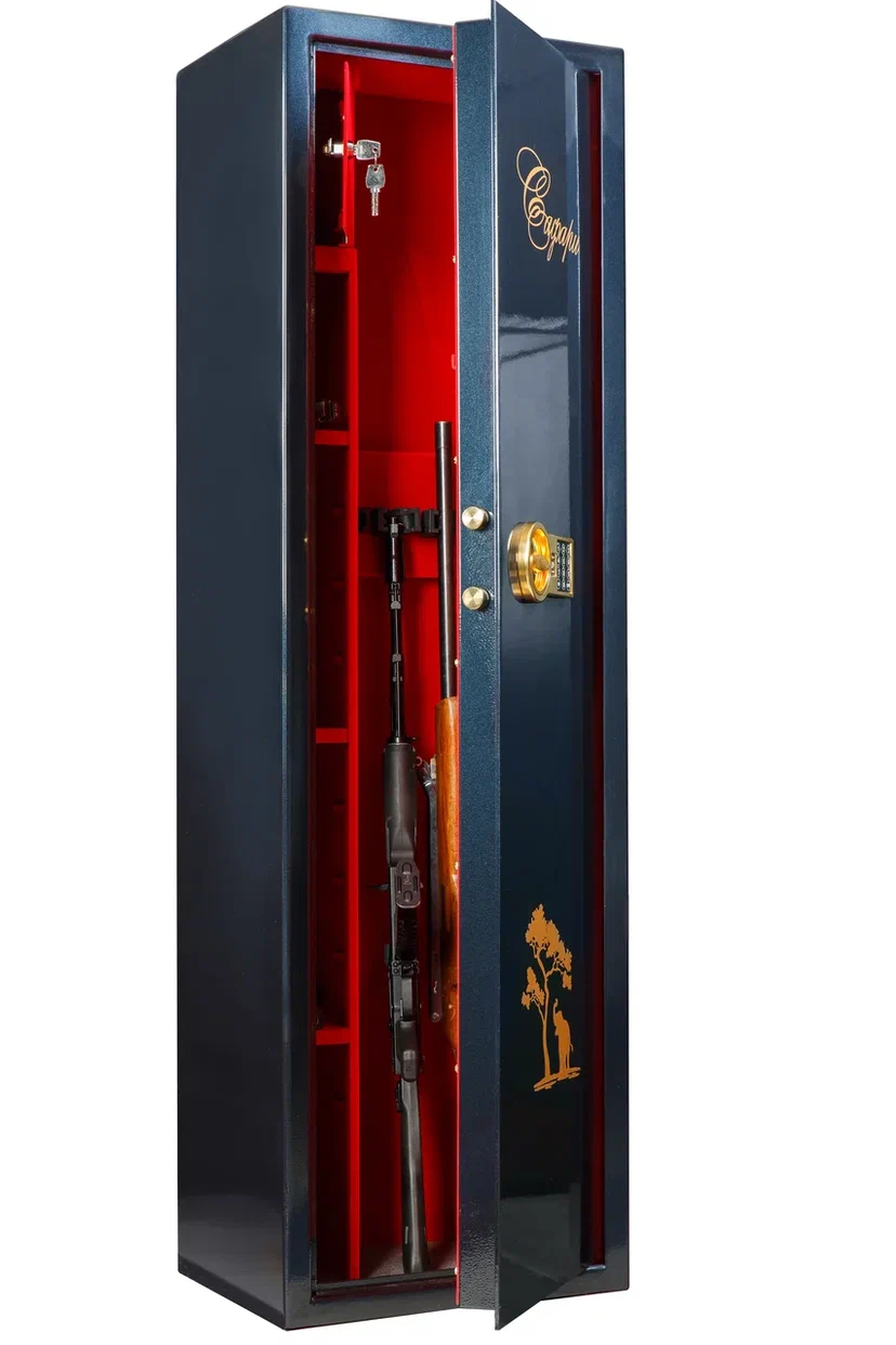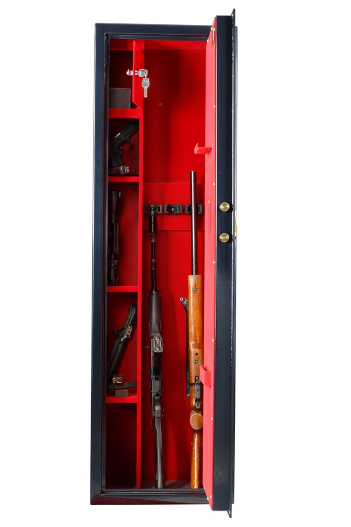 - Продуманная организация внутреннего пространства: внутри сейфа предусмотрены ложементы для хранения нескольких ружей или карабинов, отдельное запираемое отделение (трейзер) для патронов и аксессуаров, а также дополнительные полки для документов и различных предметов.