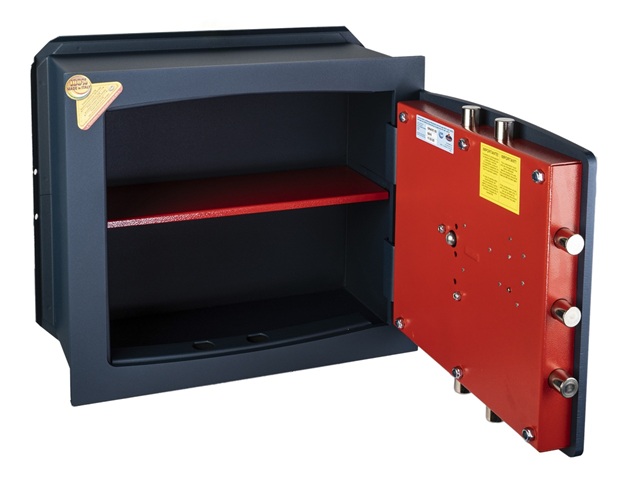 - Усиленная конструкция. Корпус и дверца изготовлены из прочной стали, устойчивой к силовым воздействиям. Лицевая панель толщиной 10 мм и надежная ригельная система запирания обеспечивают дополнительную защиту. Размещение сейфа в стене также усложняет доступ к его корпусу и препятствует вскрытию через боковые стенки.